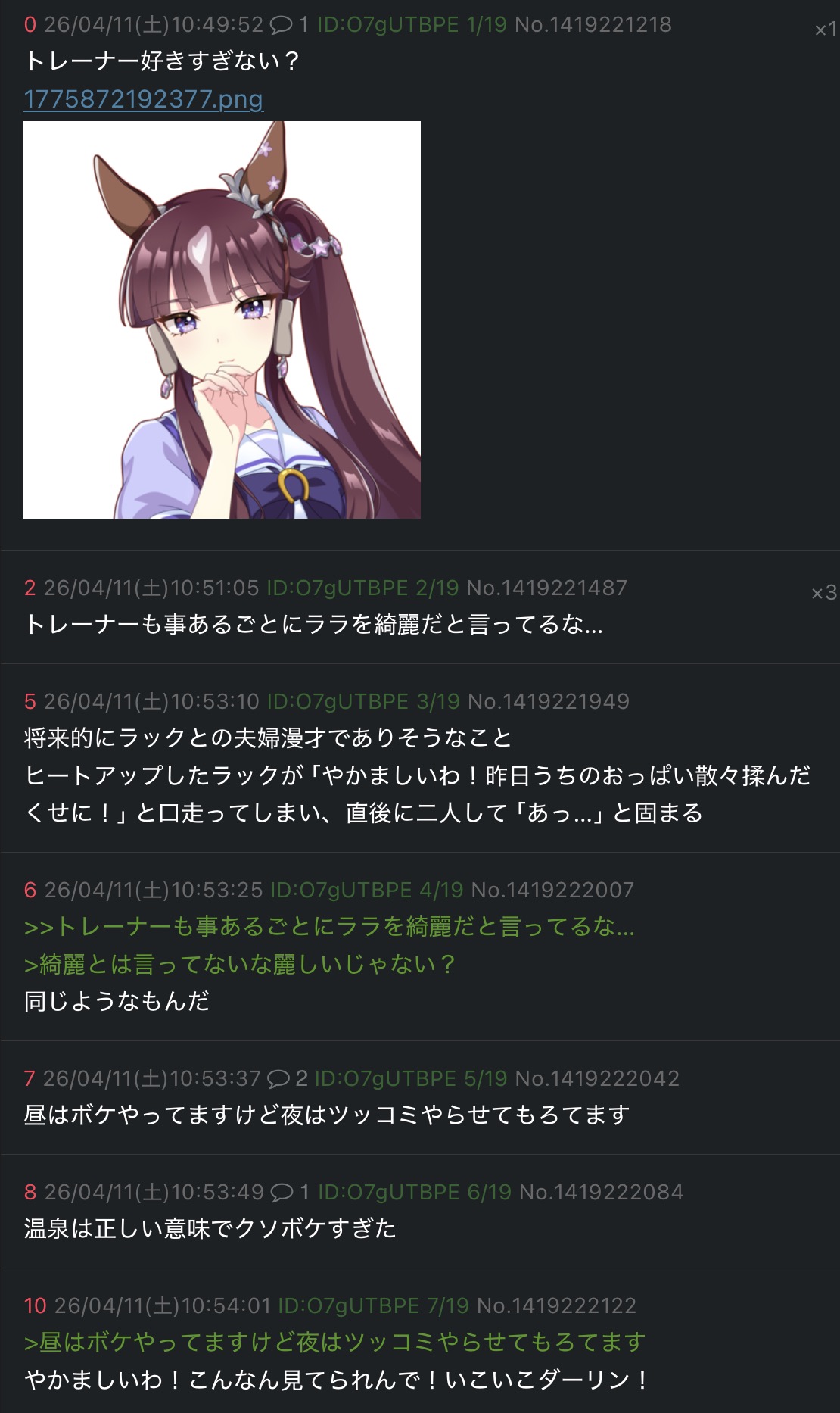 | … | 2026/04/11(土)22:25:49 ID:s2KaiaJQNo.1419436509+結婚したら旦那を尻に敷いてるウマ娘 |