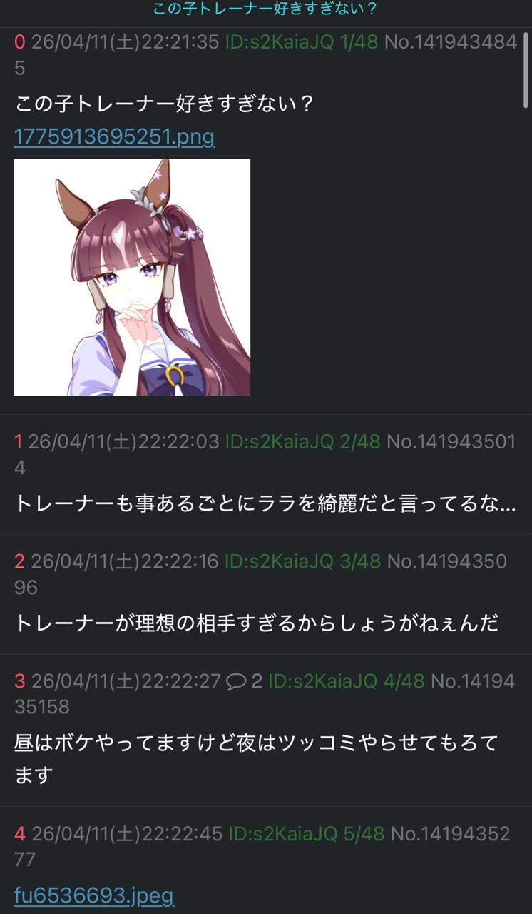 | … | 4826/04/11(土)22:52:43No.1419447973そうだねx1ID出しながらトレウマ自演伸ばしして |