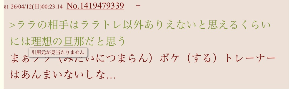 | … | 8126/04/12(日)00:23:14No.1419479339+>ララの相手はララトレ以外ありえないと思えるくらいには理想の旦那だと思う |