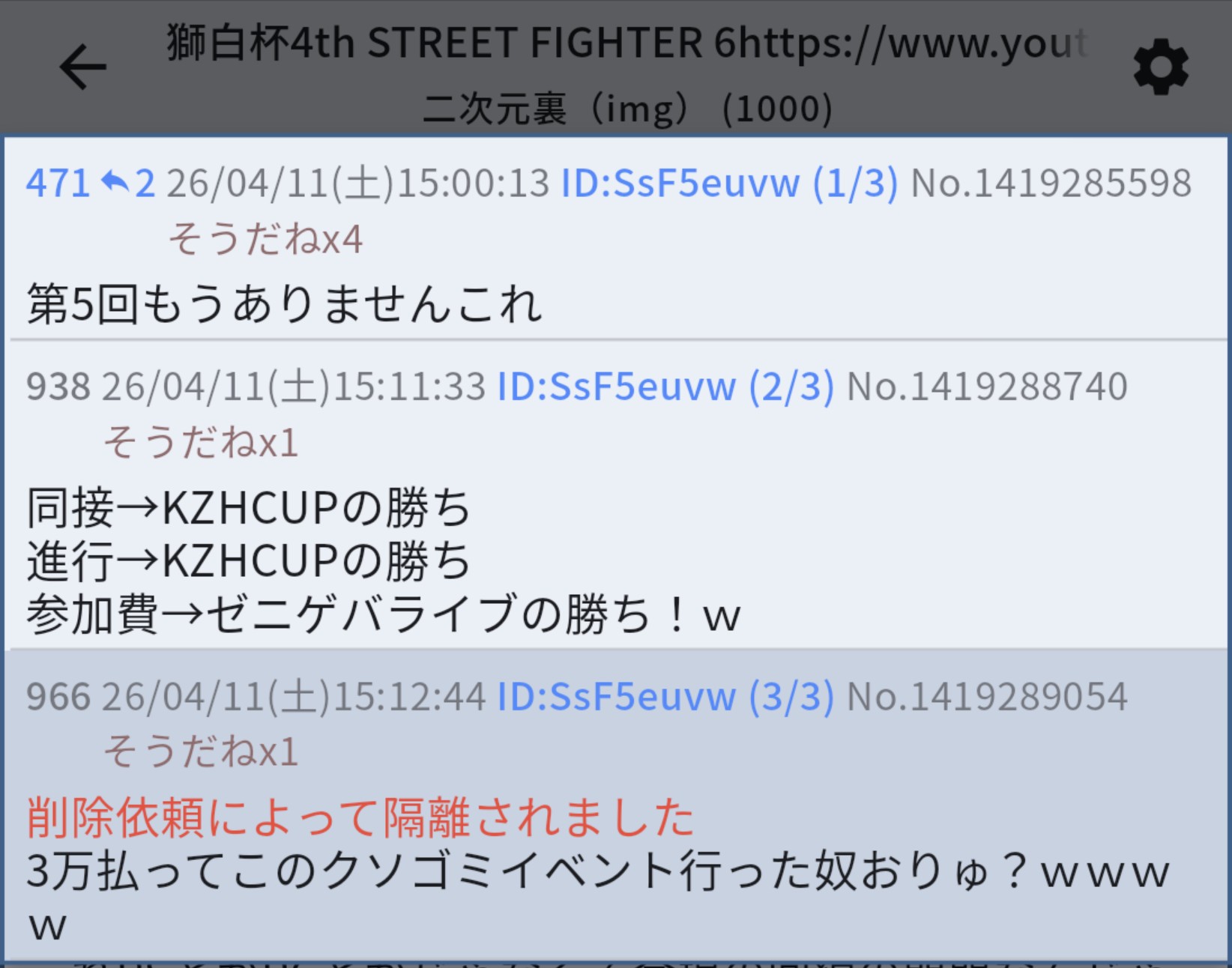 | … | 926/04/12(日)01:15:45No.1419494035そうだねx3KZHカップの時も実況スレ立ってたけど相変わらず変なのいたしもう虫みたいなもん |