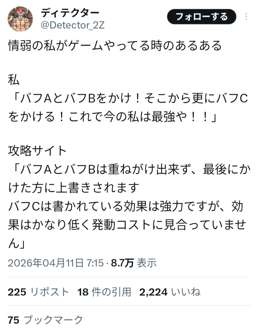 | … | 2626/04/12(日)00:46:49No.1419485908そうだねx7ELDEN RINGのバフこれ |