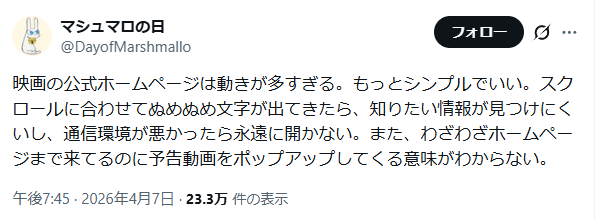 | … | 2926/04/12(日)04:28:31No.1419519049そうだねx12映画のサイトに限らないがスクロールするとスクロールしないで演出動くやつ分かりづらくてすげえ嫌 |