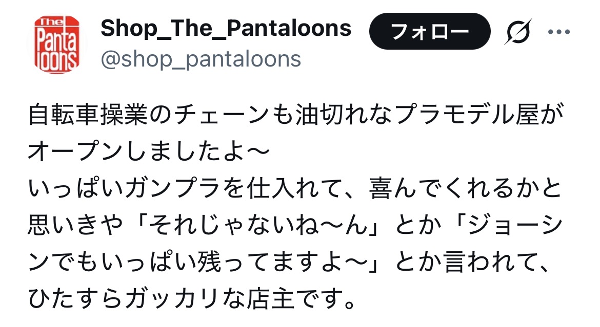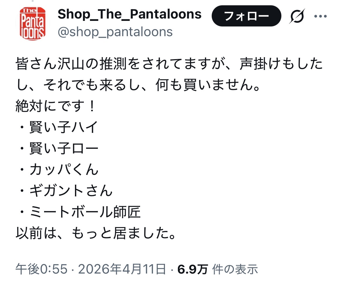 | … | 32326/04/12(日)08:53:34No.1419540593+https://x.com/shop_pantaloons/status/2040612479936725376 |