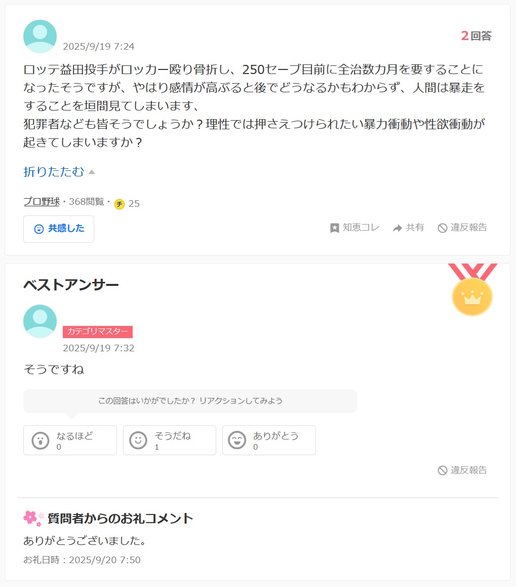 | … | 74026/04/12(日)12:47:02No.1419607202そうだねx1>つまりイライラしたら人や物に当らずベース投げてたのは正解だった? |