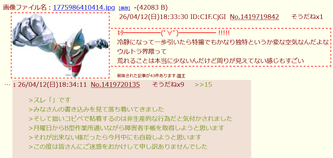 | … | 2026/04/12(日)18:41:00No.1419723004そうだねx1スレッドを立てた人によって削除されました |