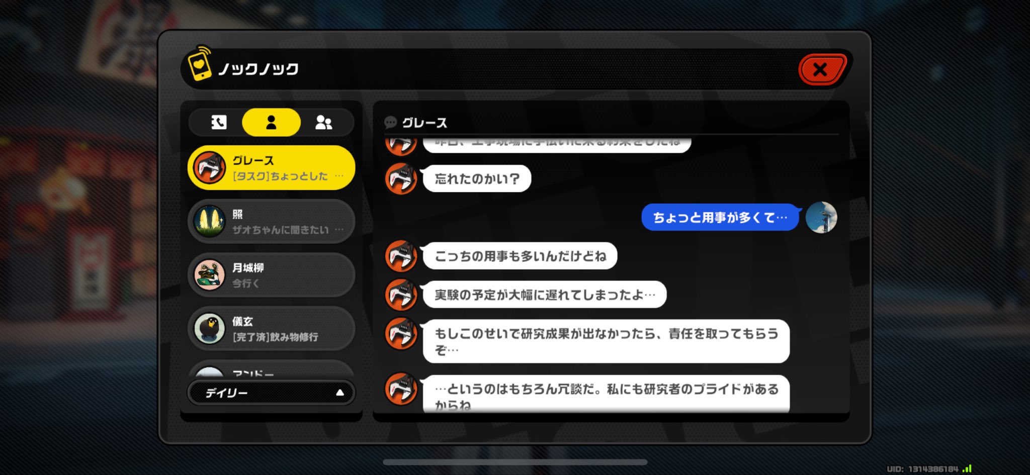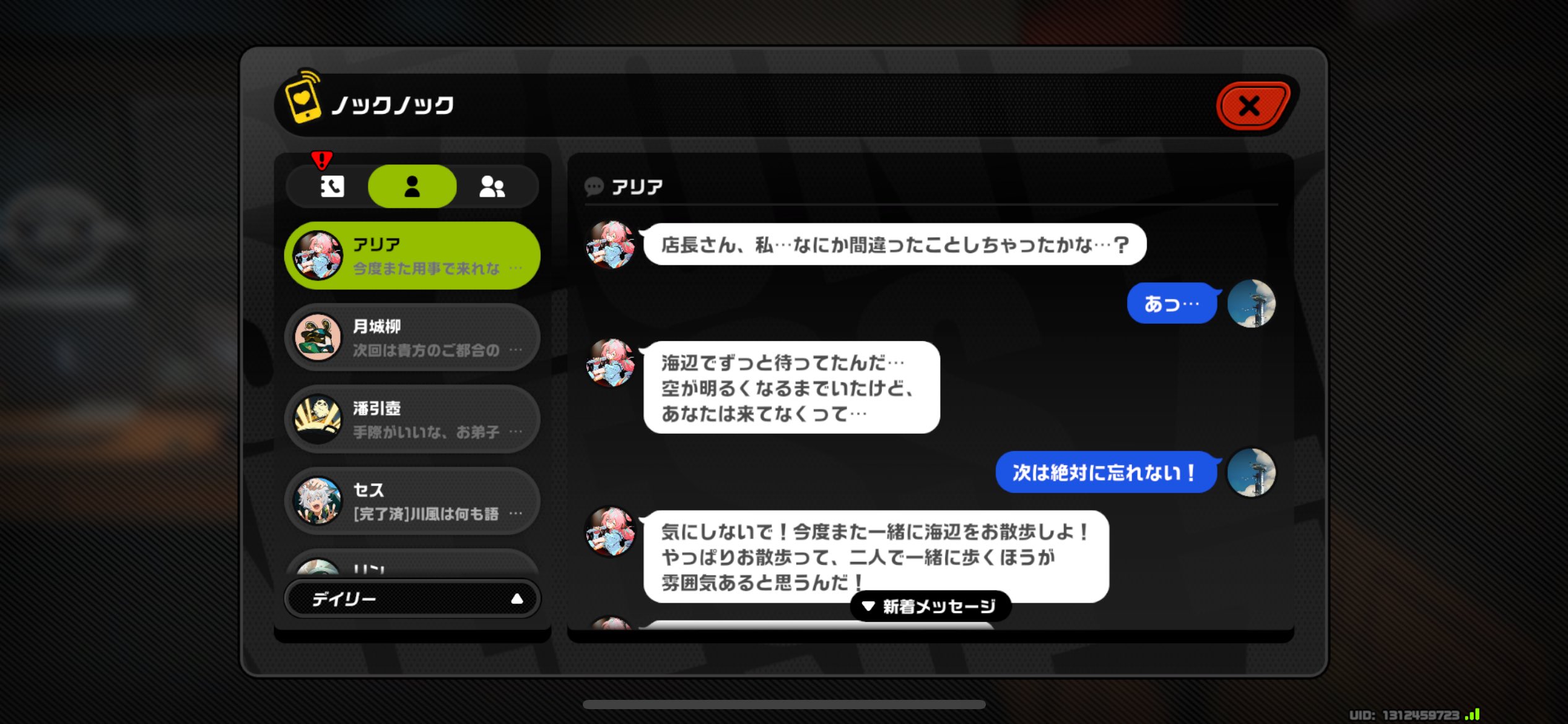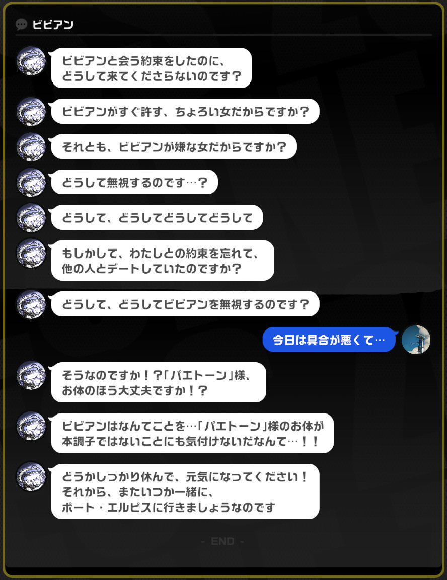 | … | 38526/04/12(日)21:58:30No.1419814258+>赤い枠でどっちで行くかの選択肢出たらそのままノックノックの画面閉じて放置ですっぽかせるよ >ワープしちゃった場合でも話しかけずに帰ればいい パエトーン様…一回ビビアンの目の前まで来たのになぜ帰るのです……? |