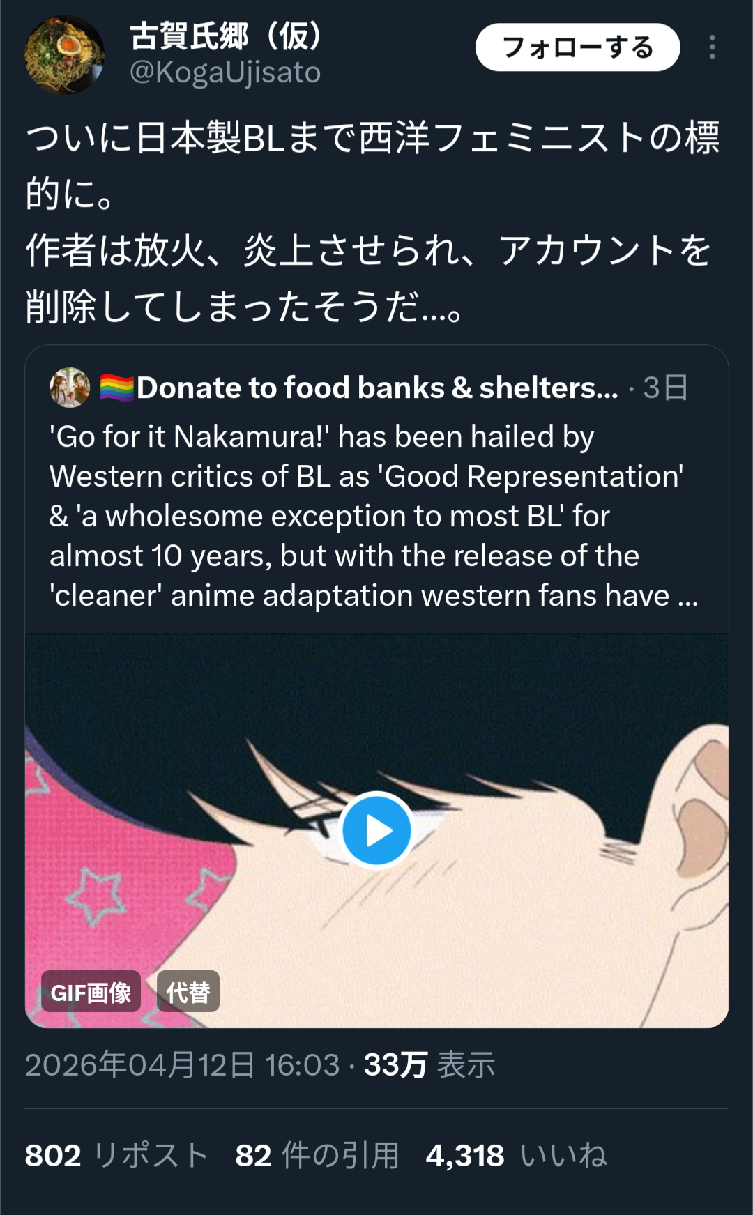 | … | 4926/04/13(月)01:34:20No.1419883932+a gente pede anime de BL mas às vezes é melhor ficar sem nada msm... se Nakamura que é tranquilissimo chega nesse tipo de audiência... |