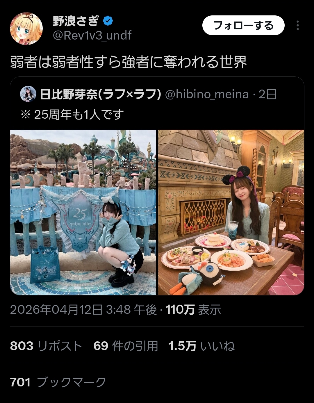 | … | 7826/04/13(月)08:24:23No.1419912101+ディズニーをしっかり楽しんでいる人を弱者だの何だの流行りの言葉で片付けたくない |