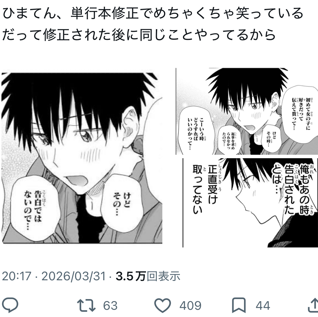 | … | 3026/04/13(月)11:32:11No.1419945813そうだねx3>1ヶ月後の告白が死体蹴りすぎるだろ… |