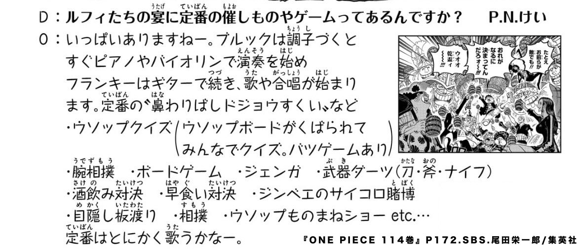 | … | 59526/04/13(月)12:48:57No.1419965051+>>>ウソップのボードゲームってルール理解して真面目に参加してくれそうなのサンジぐらいだろ |