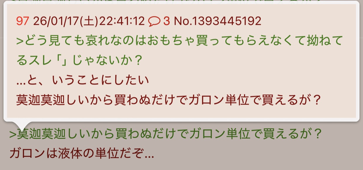 | … | 7626/04/13(月)18:59:52No.1420047325そうだねx12(買えなかったんだな…)が本当に刺さるアホが居るとは思わないじゃん |