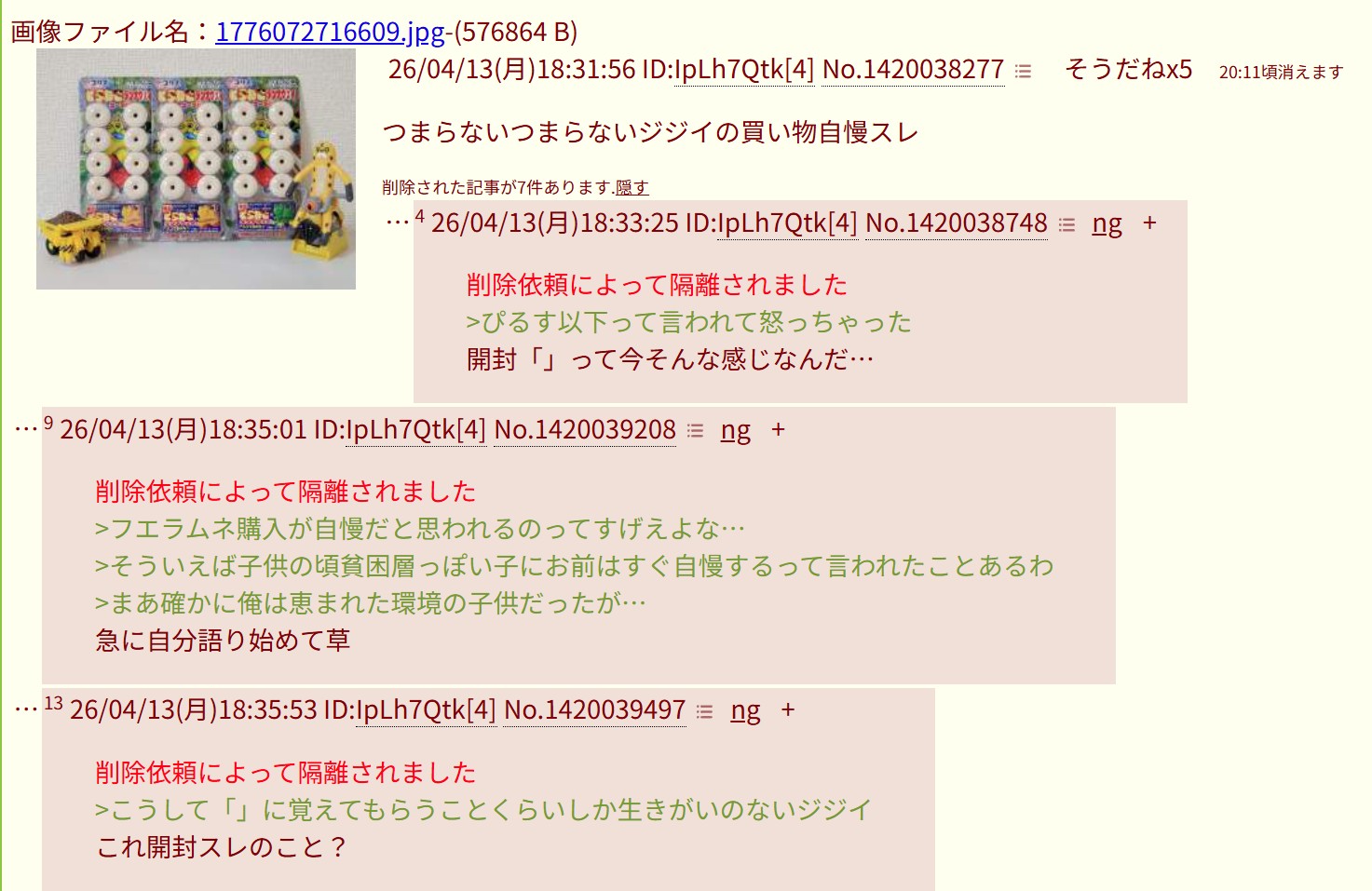 | … | 14026/04/13(月)19:34:16No.1420059549+スレ画のムジーナ買えなかったから粘着してるんだろ? |
