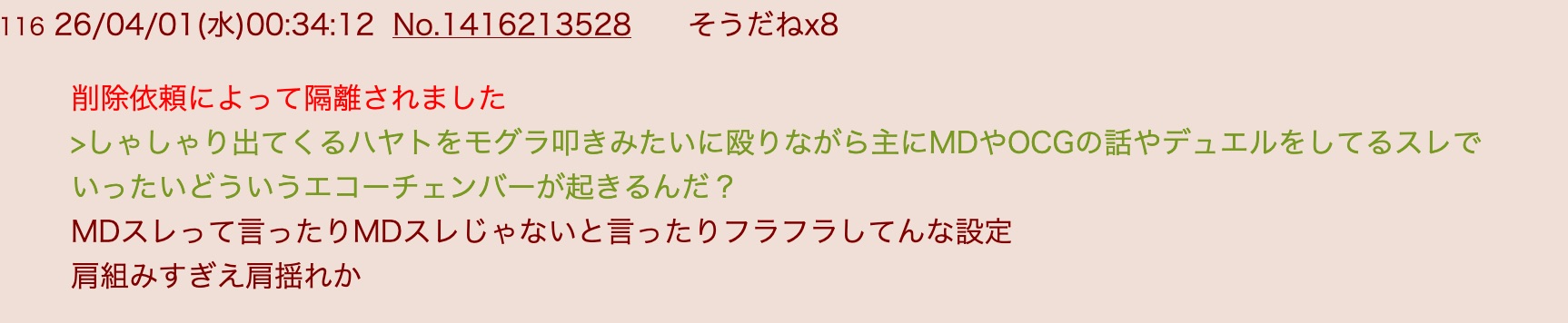 | … | 3626/04/13(月)18:55:08No.1420045671+せめてMDスレない時にやるかスレ画同じにして撹乱するとかなんかこうもっとさあ… |