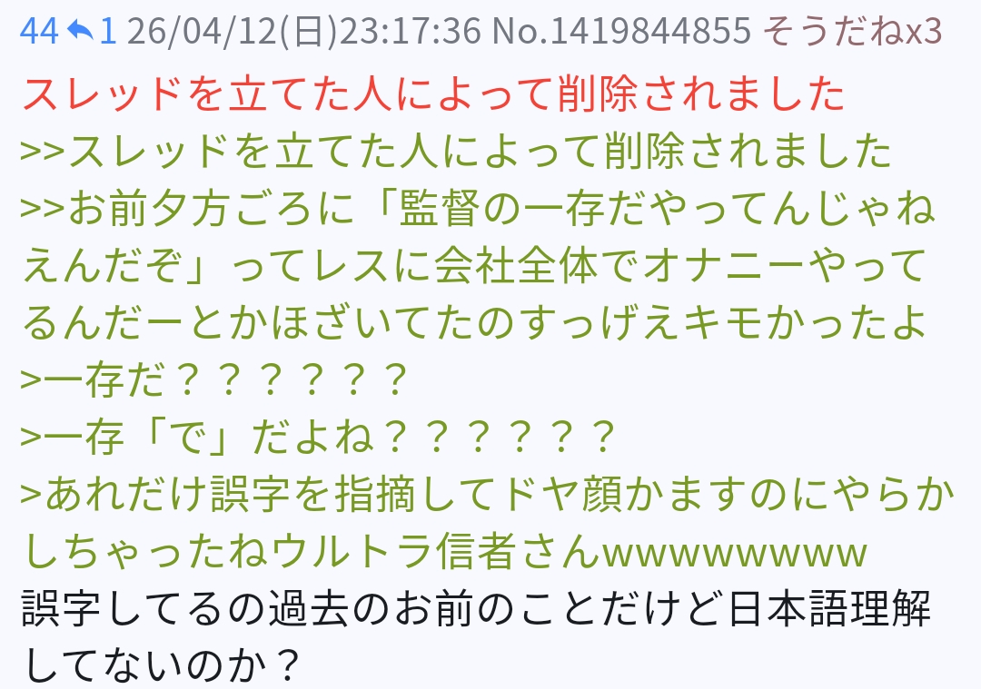 | … | 5926/04/13(月)19:02:05No.1420048118そうだねx2>ID:NEWO8m1o |