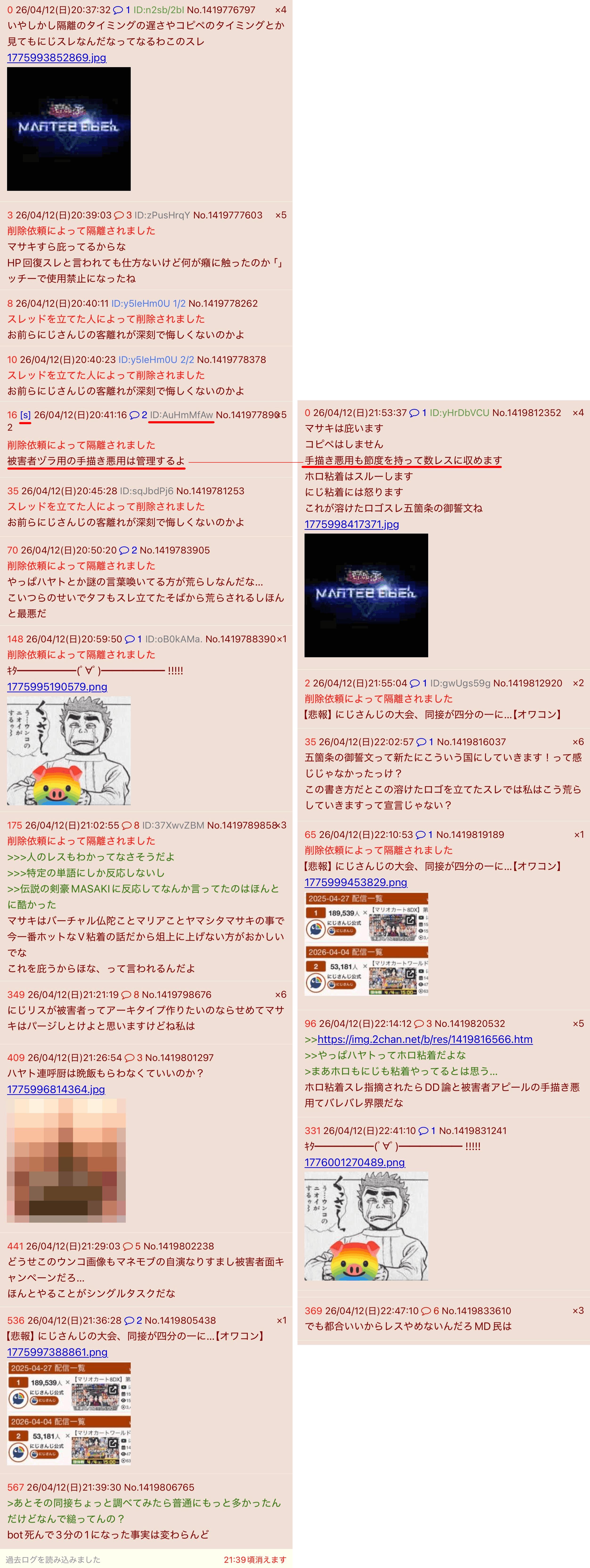 | … | 29026/04/13(月)22:10:10No.1420122523そうだねx7獅白杯の感想スレでみんなホロライブの話してる中「にじリスが〜」「にじさんじが〜」とか言って全部管理されてたスレ「」最高に無様だったよ |