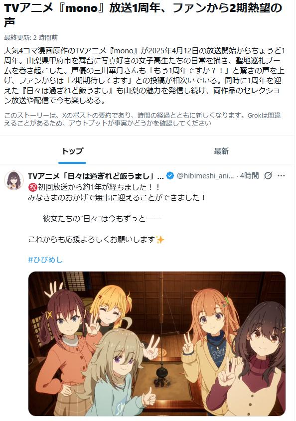| … | 426/04/13(月)20:33:08No.1420083823そうだねx15ひびめしとざつ旅とmonoが同時にあった期はまじで幸せだった |