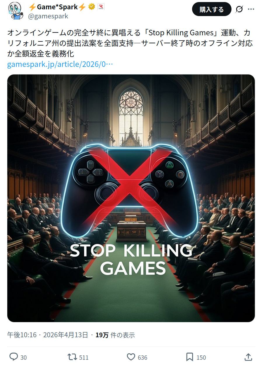 | … | 24026/04/14(火)10:45:24No.1420230600+まずこの法案が適用されるような買い切りかつオンライン認証必須でオンライン終わると遊べなくなるゲームってのがめっちゃ狭い範囲なんだよ! |
