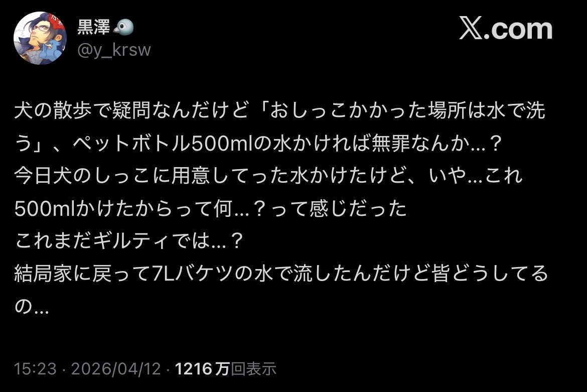 | … | 2026/04/14(火)07:25:28No.1420202469そうだねx9人の立ちションは犯罪なのに犬のションベンは無罪なのは納得いかない |
