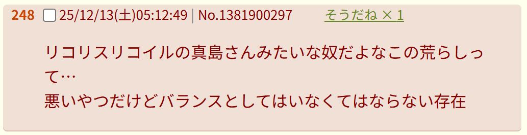 | … | 31026/04/14(火)12:38:18No.1420256709そうだねx7雑な作品叩き |
