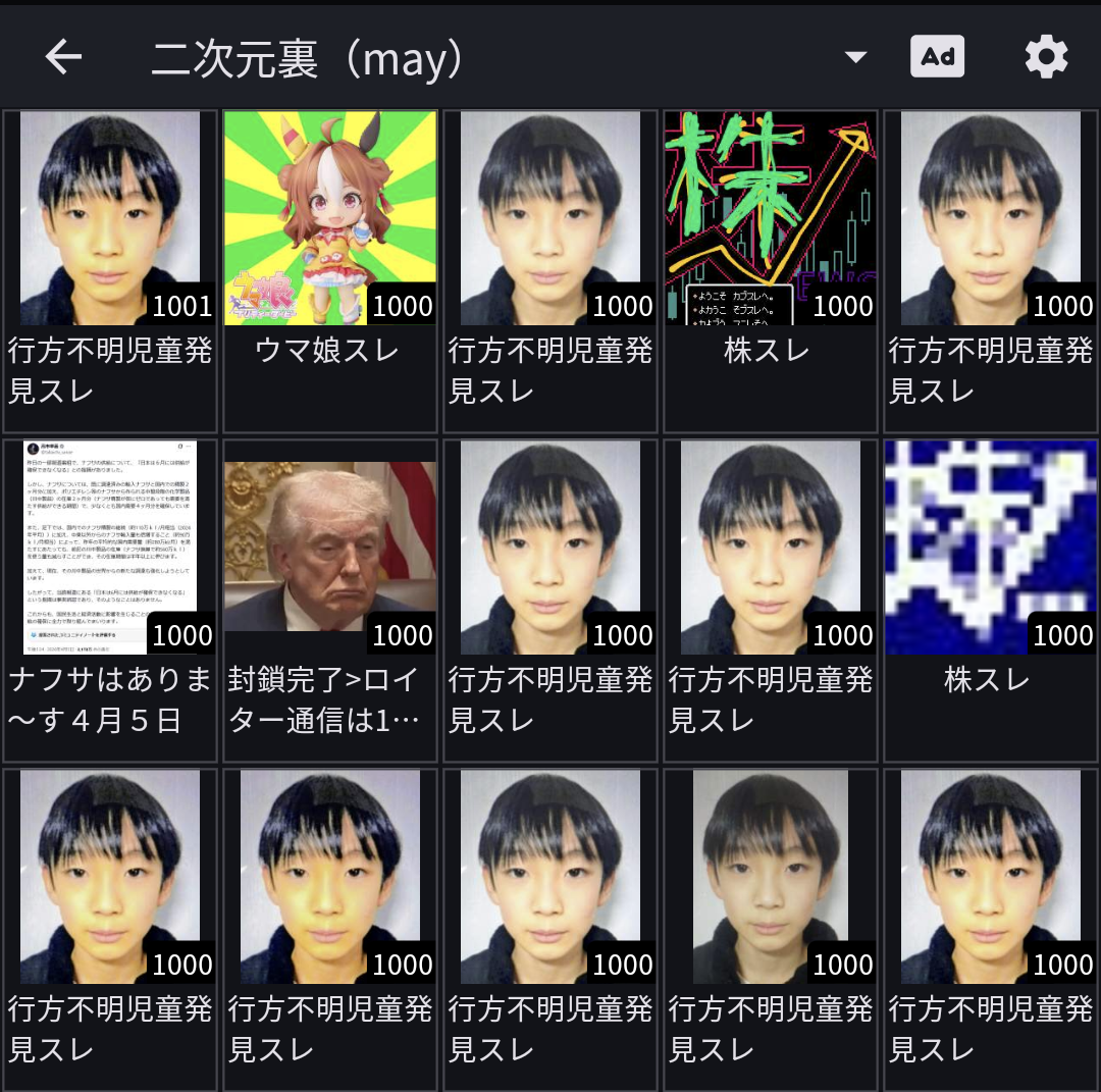 | … | 4226/04/14(火)15:01:37No.1420288878そうだねx3>お前が知らんだけで今も行方不明のガキスレ画にしてスレ立てしてるしトランプスレもしょっちゅう経ってるぞ |
