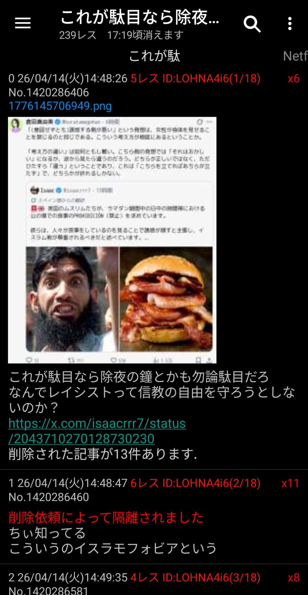 | … | 4026/04/14(火)16:30:15No.1420305918そうだねx3>えっこんなクソスレで管理を!?と思ったら消されてるレスでスレ蟲の中身察した |