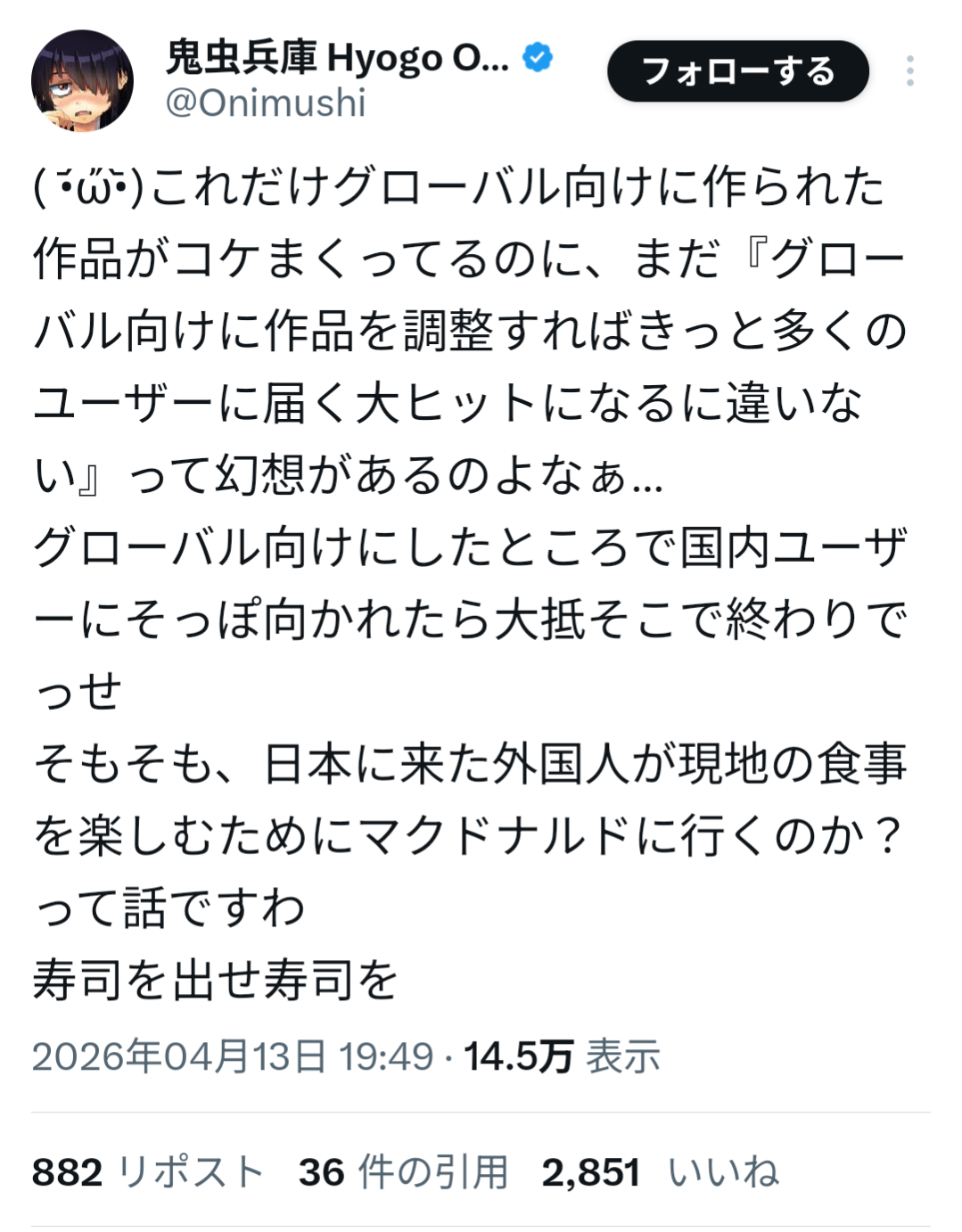 | … | 4226/04/14(火)16:37:16No.1420307312そうだねx1>何がどうなったらグローバルなんだ? |