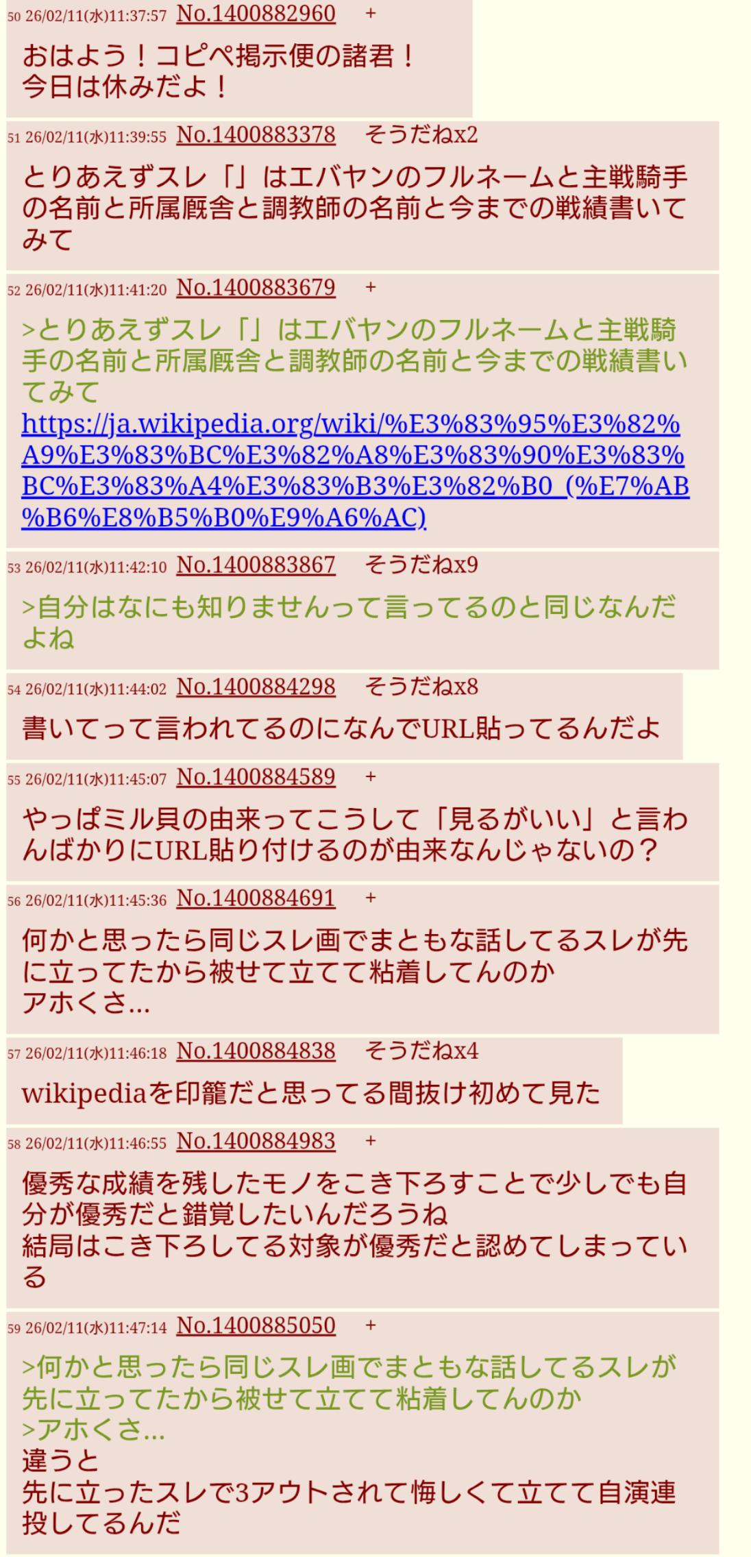 | … | 16326/04/14(火)19:04:02No.1420344610+エバヤン最強最強言ってるけどどんなレースしてるか知ってるの?った聞かれてnetkeibaのエバヤンのプロフィールのリンク貼るアホだし |