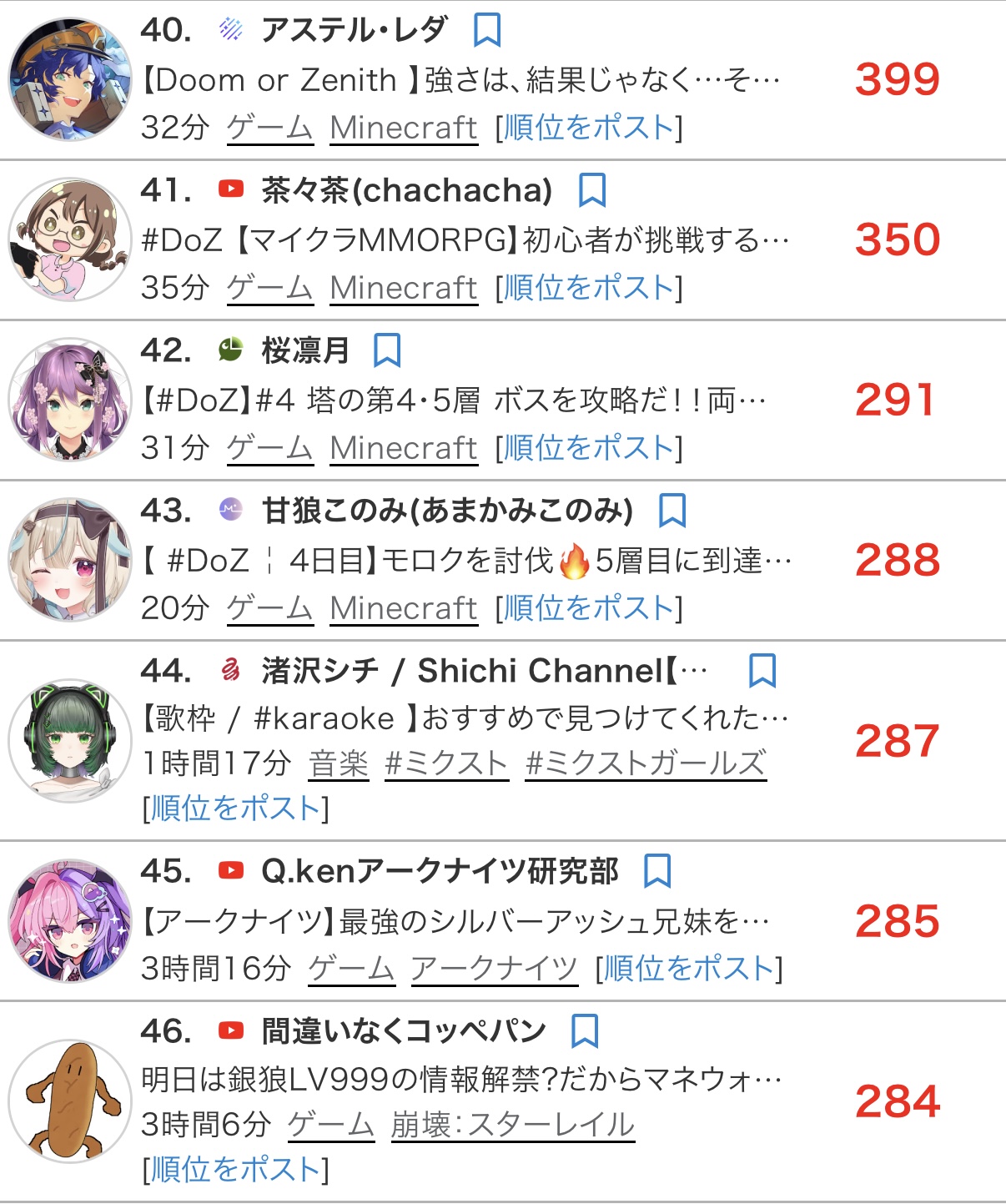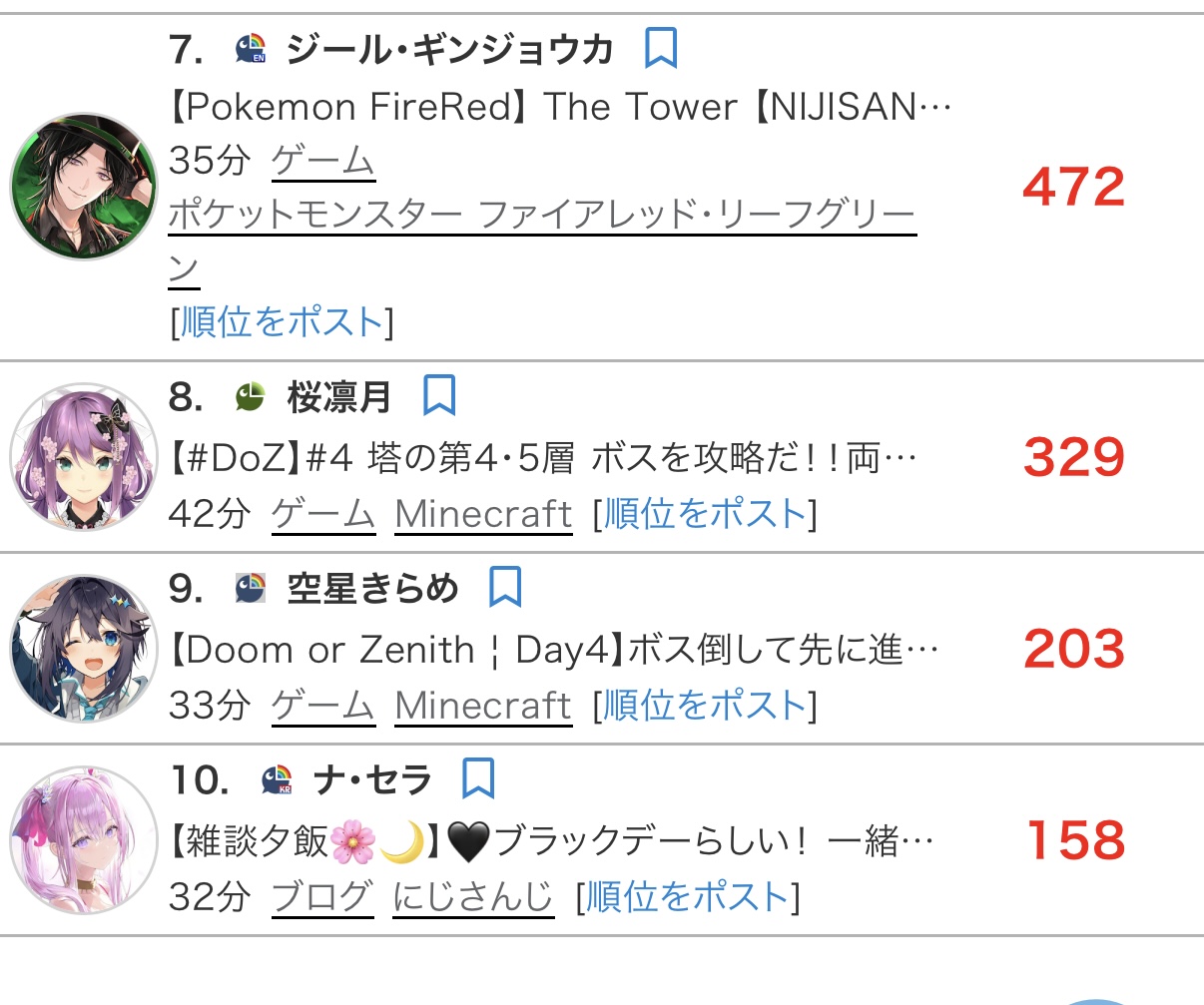 | … | 9426/04/14(火)18:41:51No.1420337662そうだねx7>>ホロスタの数字がグロいとか言い出したらにじさんじの底の方はそれ以下がゴロゴロいるけど… |