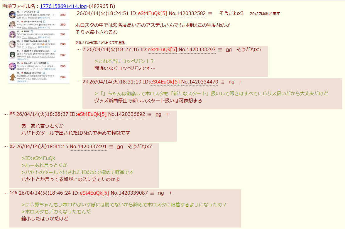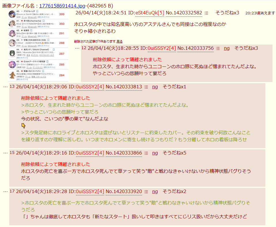 | … | 526/04/14(火)18:27:09No.1420333262そうだねx42この掲示板24時間にじさんじリスナーがホロ粘着してんな |