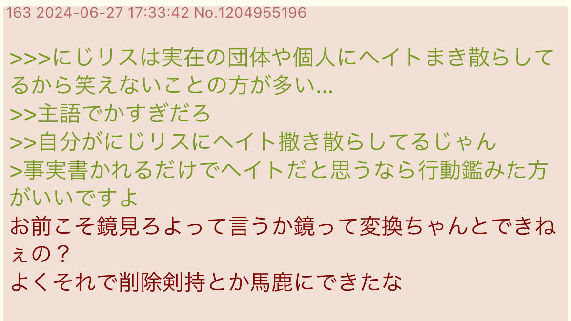 | … | 8626/04/14(火)18:41:15No.1420337493そうだねx14だからにじさんじが被害者になりたいならぺ実とかターネイとかヤマKとかVアンチしてるにじリスを潰してこいって |