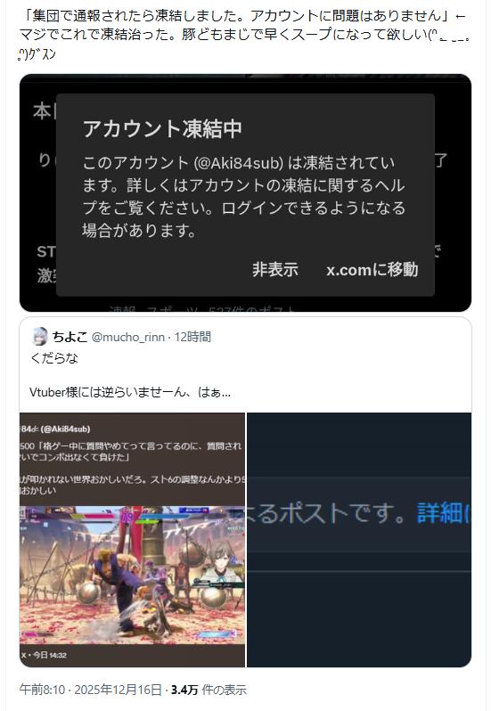 | … | 26326/04/14(火)19:10:32No.1420346682そうだねx10叶ってスト6に限定しても大会で負けたらコメントが悪いとか他責しだすカスじゃん |