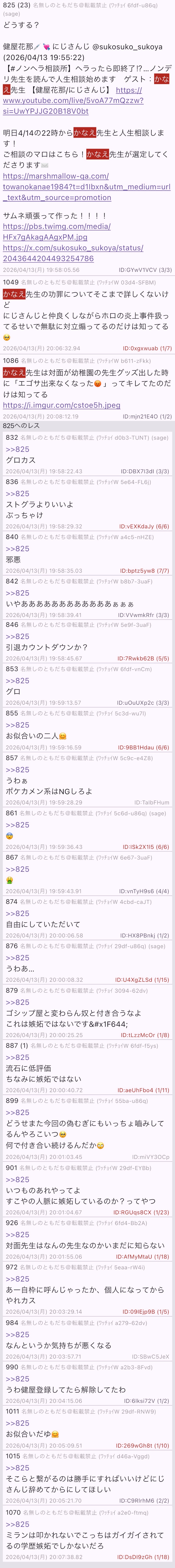 | … | 32026/04/14(火)19:38:58No.1420356810そうだねx1>なんかにじ抜きにしても普通に炎上してもおかしくないことばっかりしてんな... |