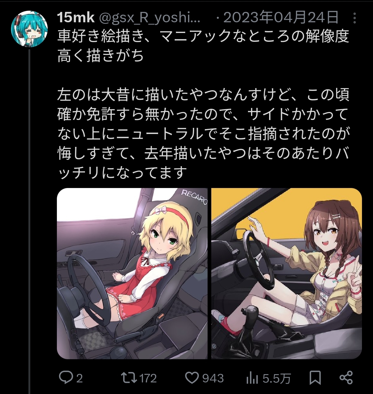 | … | 526/04/14(火)20:50:48No.1420383540+>桃華とおそろいの車乗りたい |