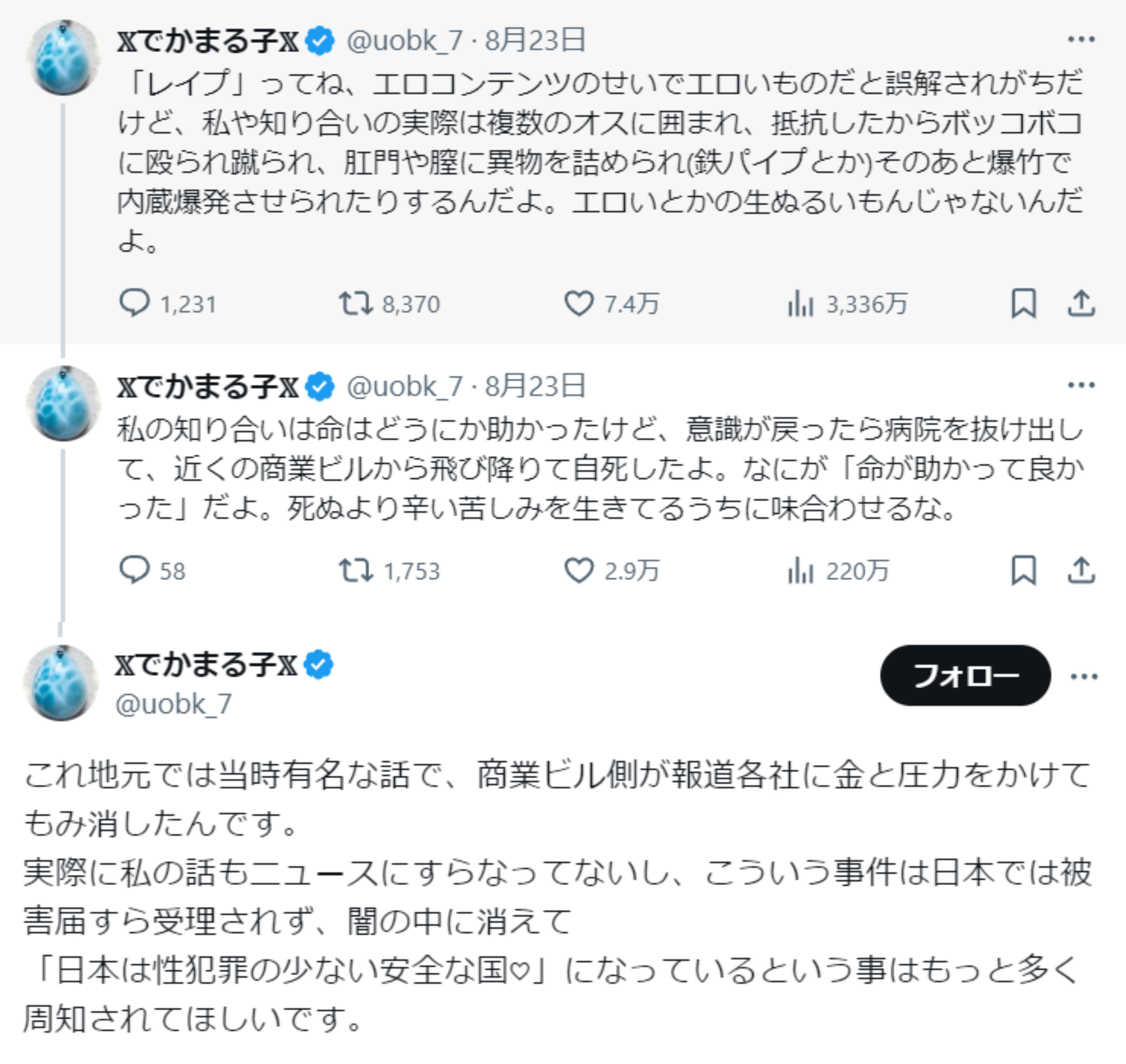 | … | 9426/04/14(火)22:48:05No.1420429734そうだねx1レイプの話と商業ビルの自殺もみ消しの話関連性ないよね…? |