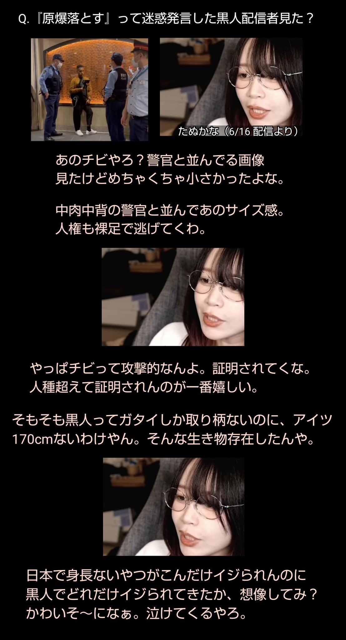 | … | 13226/04/15(水)12:22:05No.1420546241+日本でJCレイプした黒人捕まえたらBLM運動されるぐらいあいつら日本人を人間だと思ってないよ |