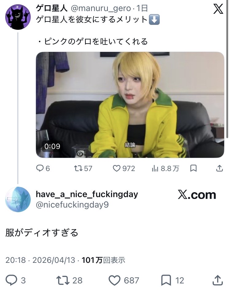 | … | 1526/04/15(水)12:52:52No.1420556119+https://x.com/manuru_gero/status/2043656316712112604?s=46&t=Z_-gwhg6arXGb86BJqFtCg |