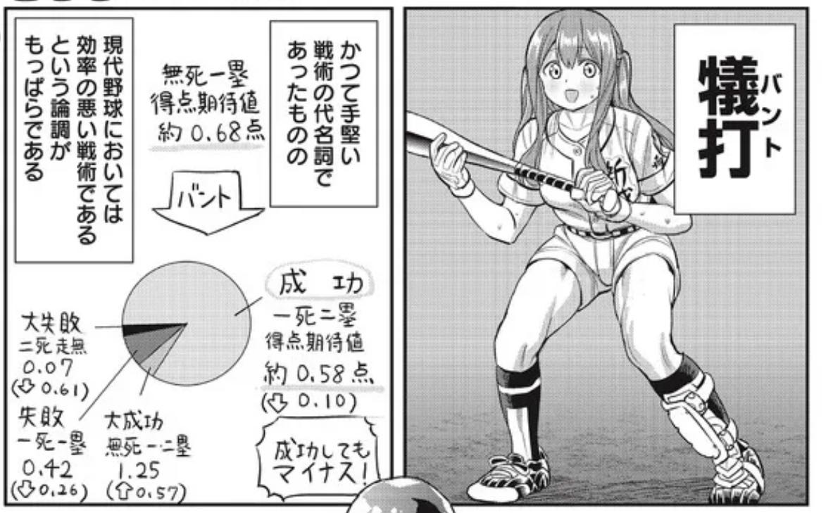 | … | 3226/04/15(水)20:33:59No.1420671949+スレ画はノーアウト一塁で四番がバントをした時の解説のコマ |