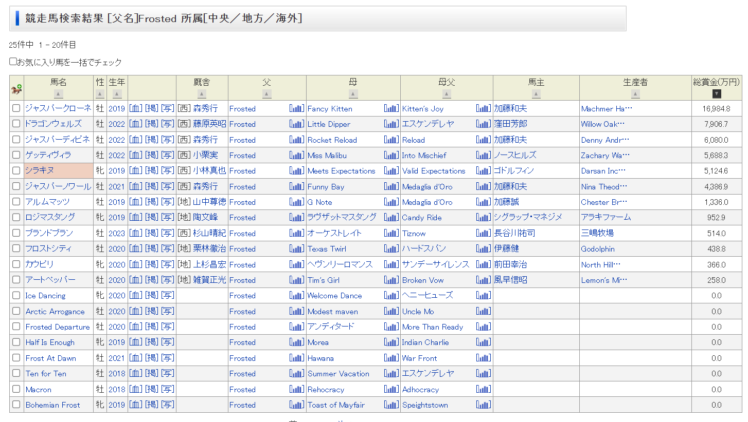 | … | 526/04/15(水)20:56:00No.1420680734+Frosted産駒って数が少ない割によく走ってますね |