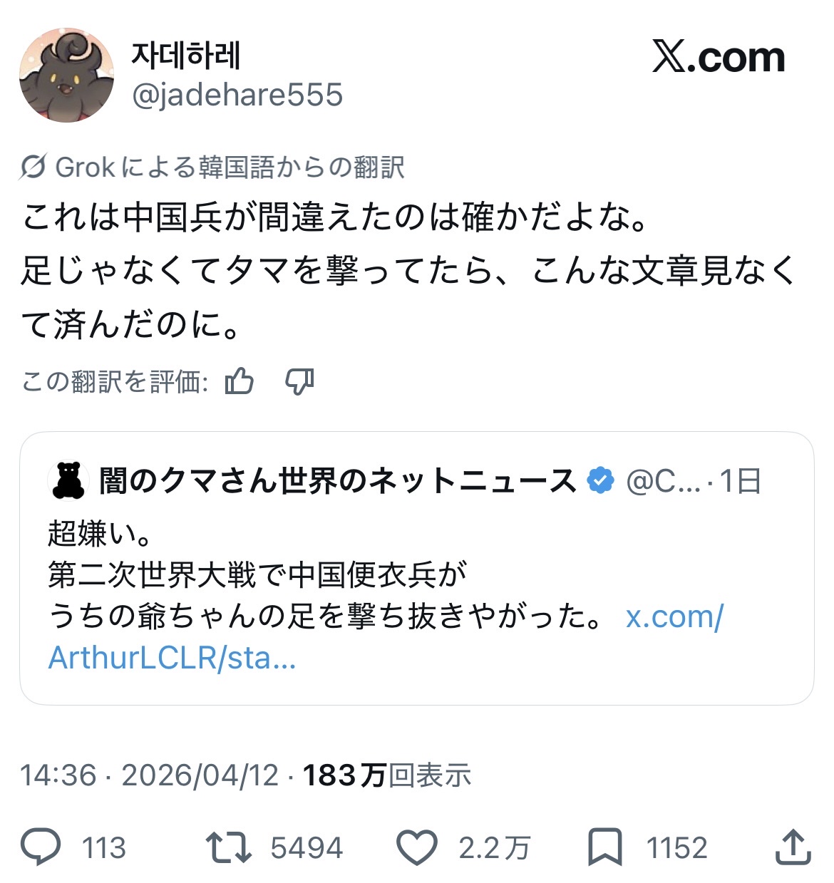 | … | 12926/04/15(水)22:42:37No.1420724217そうだねx1まずい顔がアカンやつが消してる |