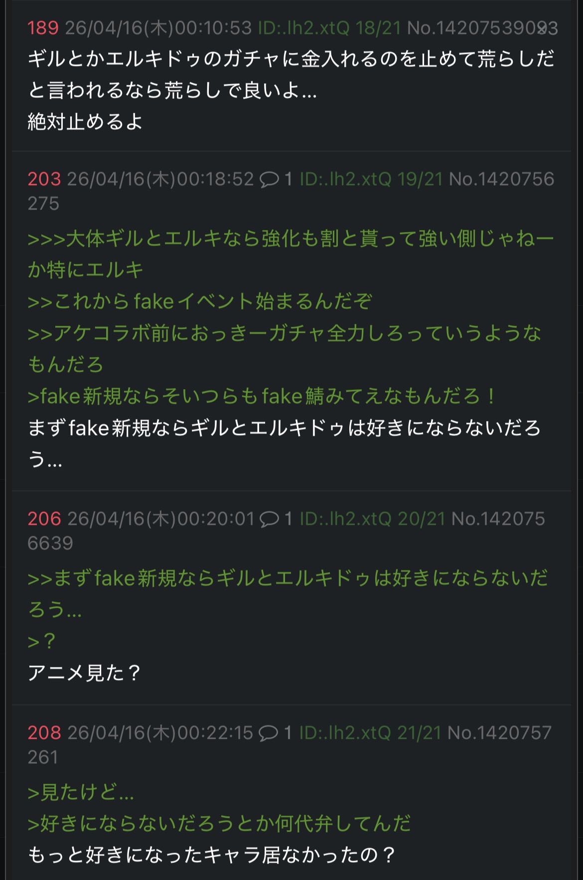 | … | 9626/04/16(木)01:26:38No.1420772048そうだねx1>>Fake好きだからギルもエルキ引きたいって話を延々好きになるはずがない!ありえない!って言ってるだけじゃん… |