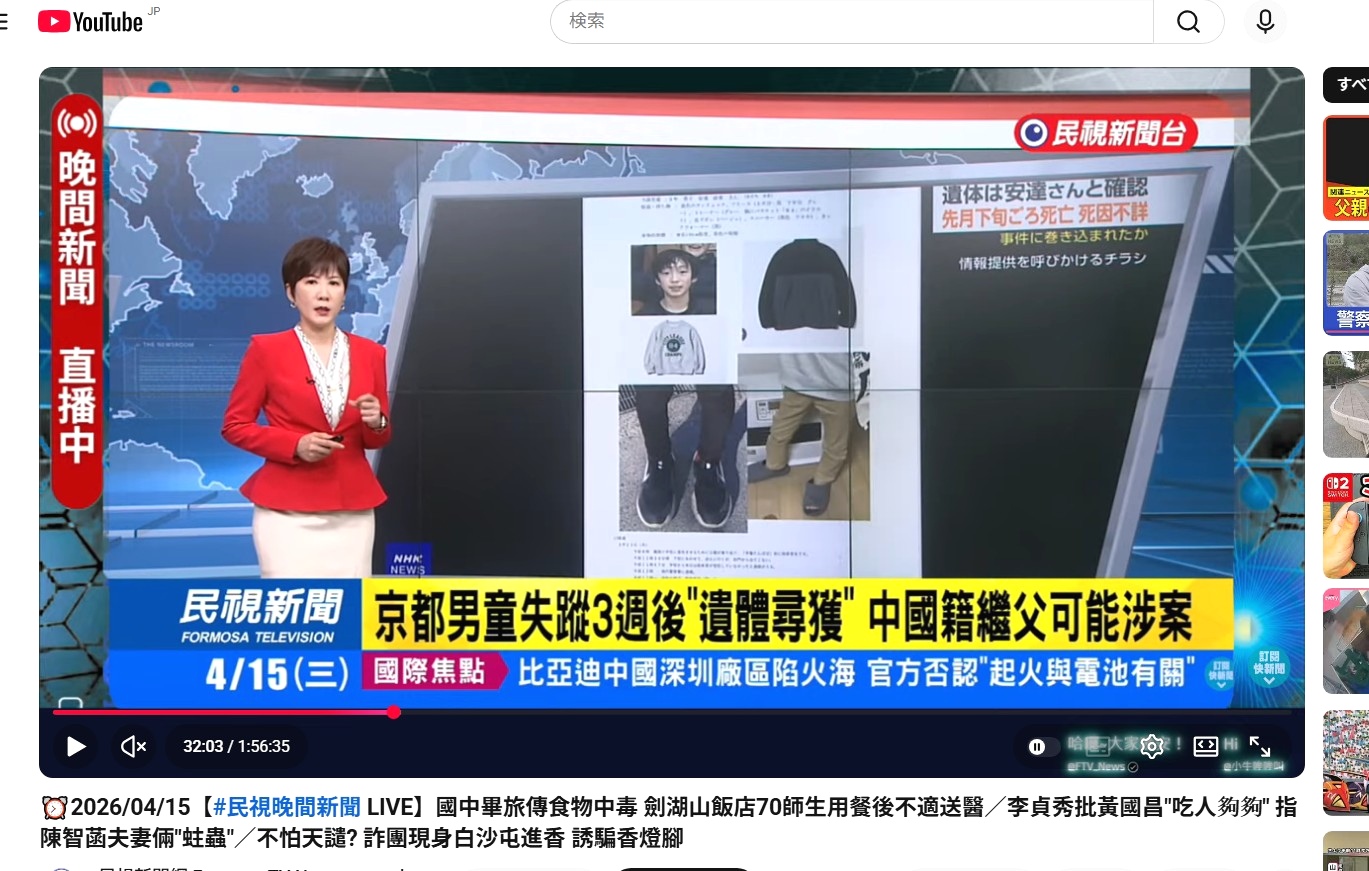 | … | 65326/04/16(木)06:39:15No.1420788782そうだねx1>台湾ではニュースで中国籍って報道されてるけど |