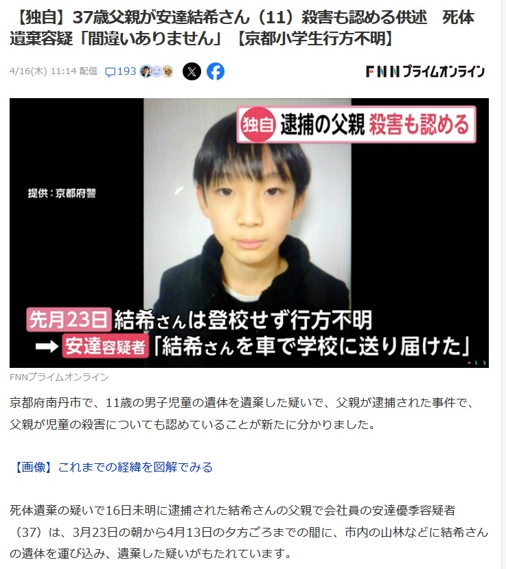 | … | 71526/04/16(木)13:30:30No.1420861723+>>文春「犯人は生まれも育ちも京都でしたあと中国籍が云々とかの記事は書いてません」 |