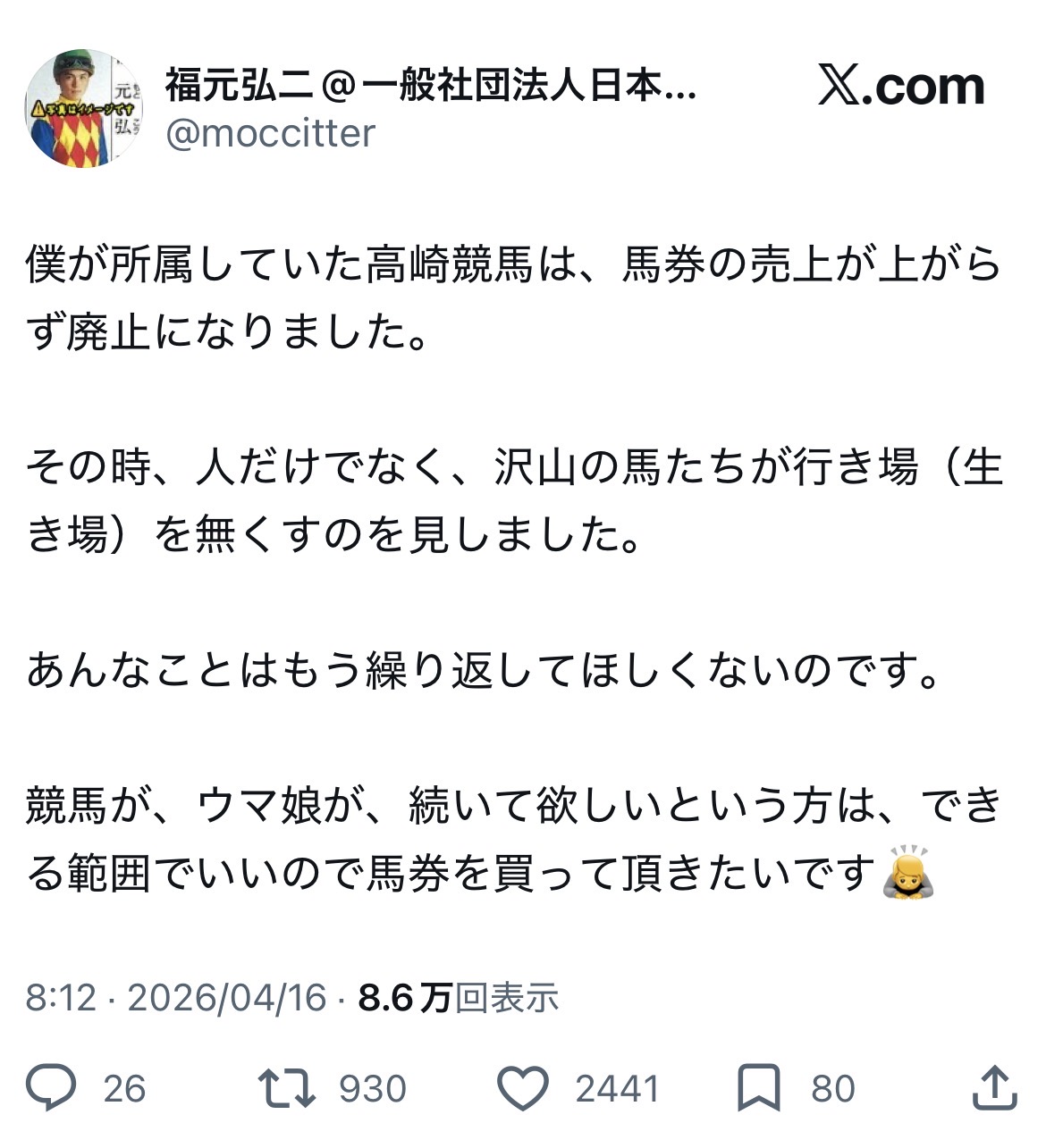 | … | 3926/04/16(木)12:02:16No.1420837361そうだねx4>言っちゃなんだけど競馬という興業それ自体が動物虐待だと思うから |