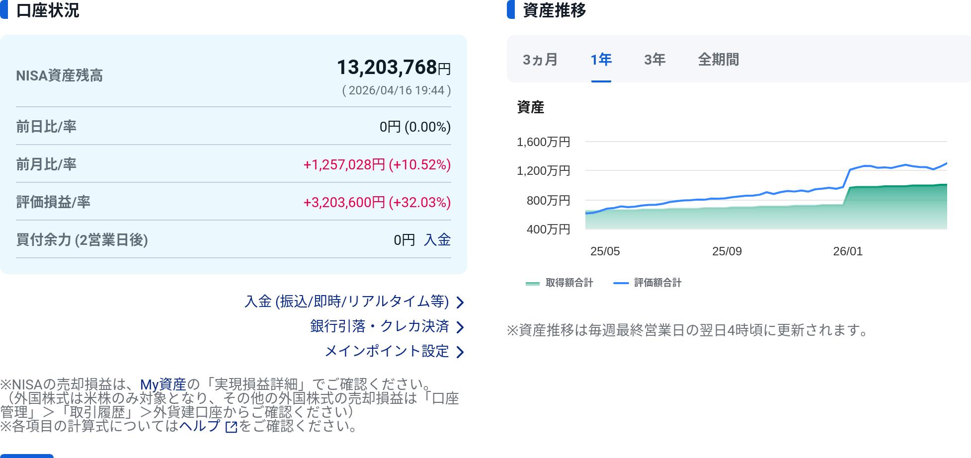 | … | 7026/04/16(木)19:52:54No.1420943794+800ちょっとまで成長した クソ雑魚入金のDCと比べてNISAの方が額大きいから増えも大きくて楽しいな |