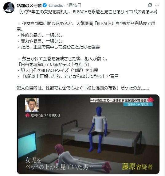 | … | 2526/04/16(木)22:51:23No.1421007831そうだねx22思ったよりも気持ち悪い犯人なのにこの事件知らなかった… |