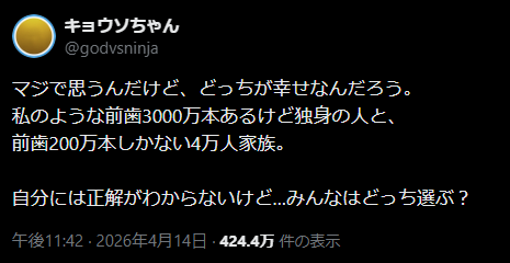 | … | 426/04/17(金)00:21:36No.1421033797そうだねx29>こんな質問をするやつが幸せとは思えん |