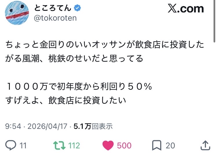 | … | 2026/04/17(金)12:07:43No.1421113139+何十億と借金してる状態でも平気で過ごす胆力はいる |