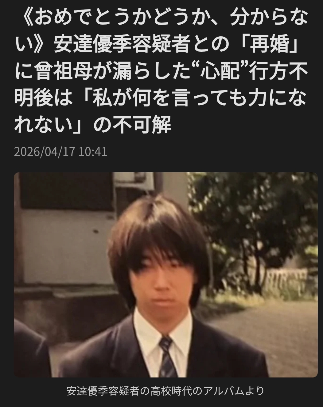 | … | 4126/04/17(金)14:34:16No.1421146038そうだねx22これ言ってもしょうがないんだけど容疑者の子供時代の写真出されてもな… |