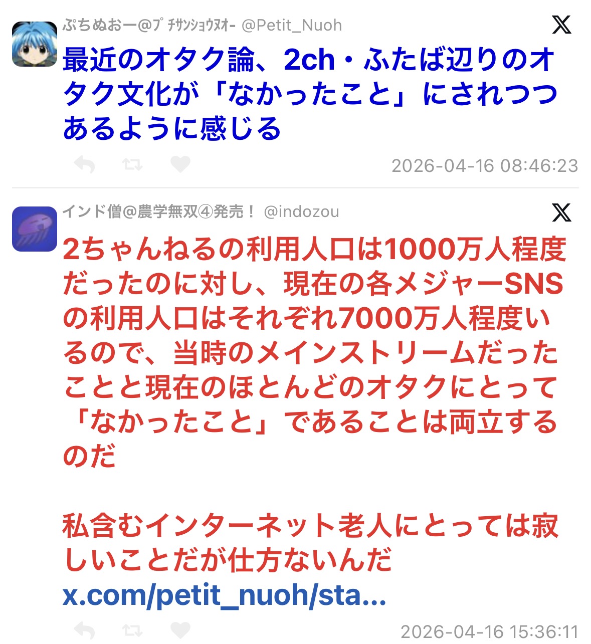 | … | 6626/04/17(金)22:48:53No.1421300348+Xに7000万人いるとしてもXの大半は非オタなんだからその7000万でオタクを語るの大分危うくないか |