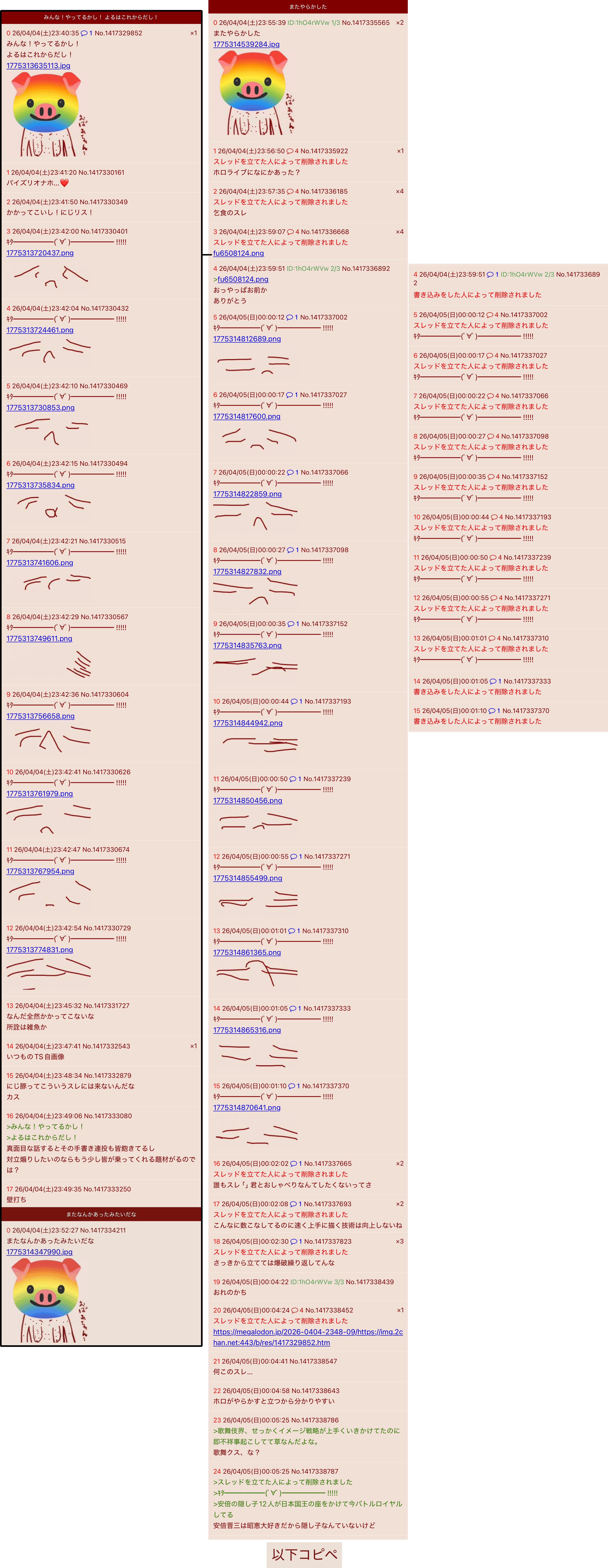 | … | 7026/04/17(金)23:42:00No.1421320723+>発狂乱立がすげぇ |